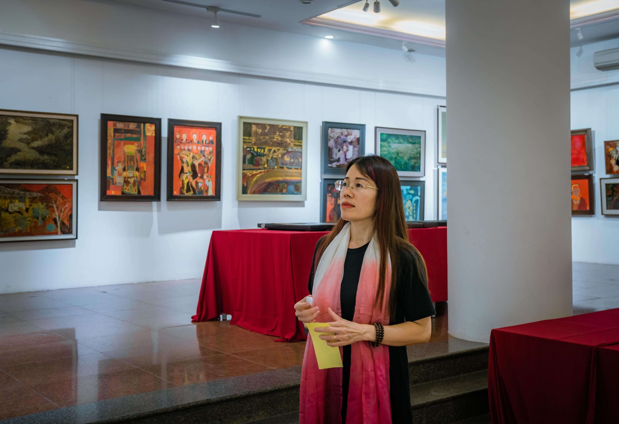 Chị Nguyễn Thị Thu Hà – Gallery Owner thưởng lãm các tác phẩm trong ngày đầu khai mạc triển lãm