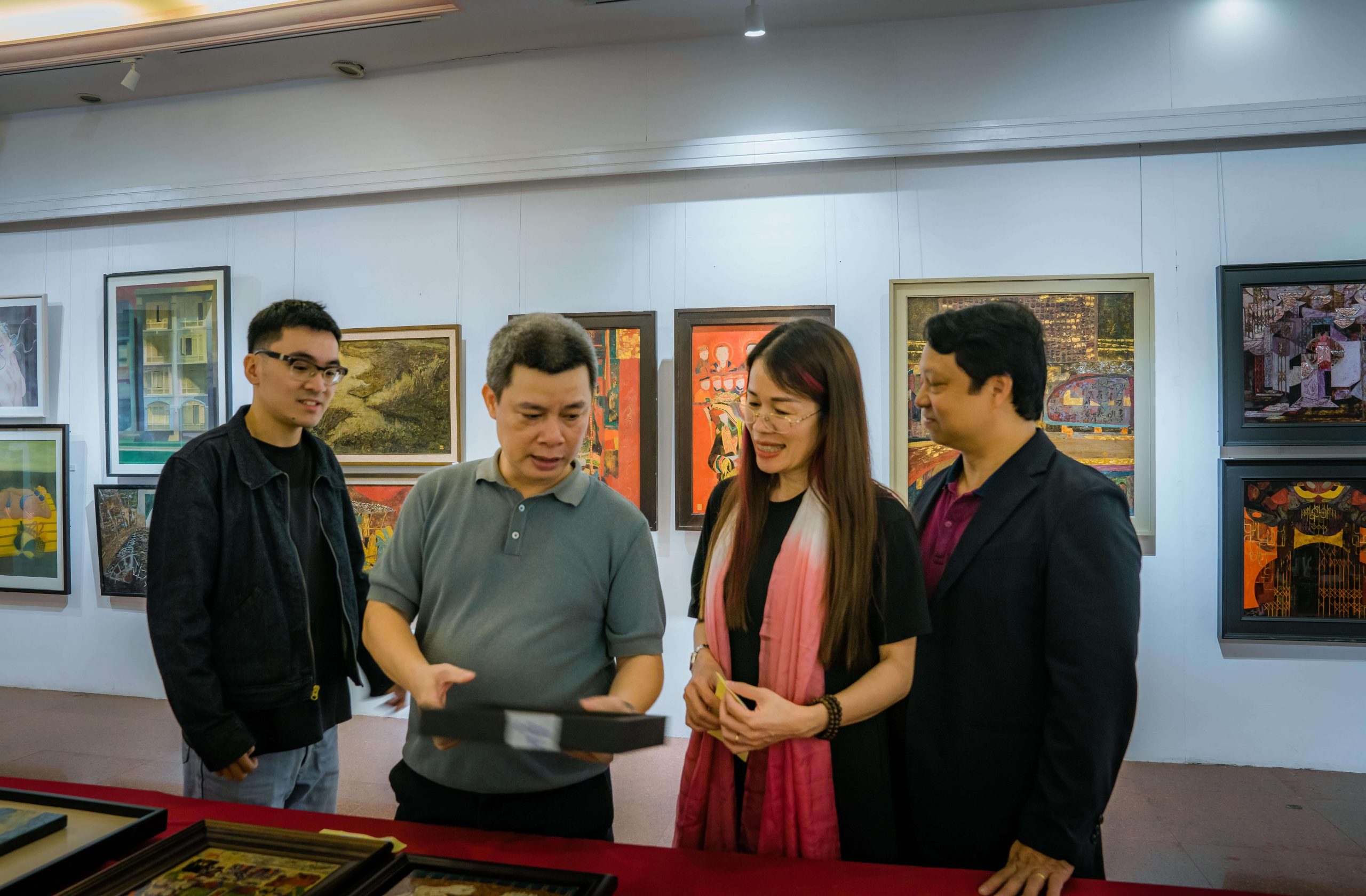 Ban lãnh đạo Nguyen Art Gallery và họa sĩ Triệu Khắc Tiến đã cùng có mặt trong lễ khai mạc, chia sẻ niềm hứng khởi trước những tác phẩm tiêu biểu của sinh viên ba chuyên ngành: Sơn dầu – Sơn mài – Lụa.