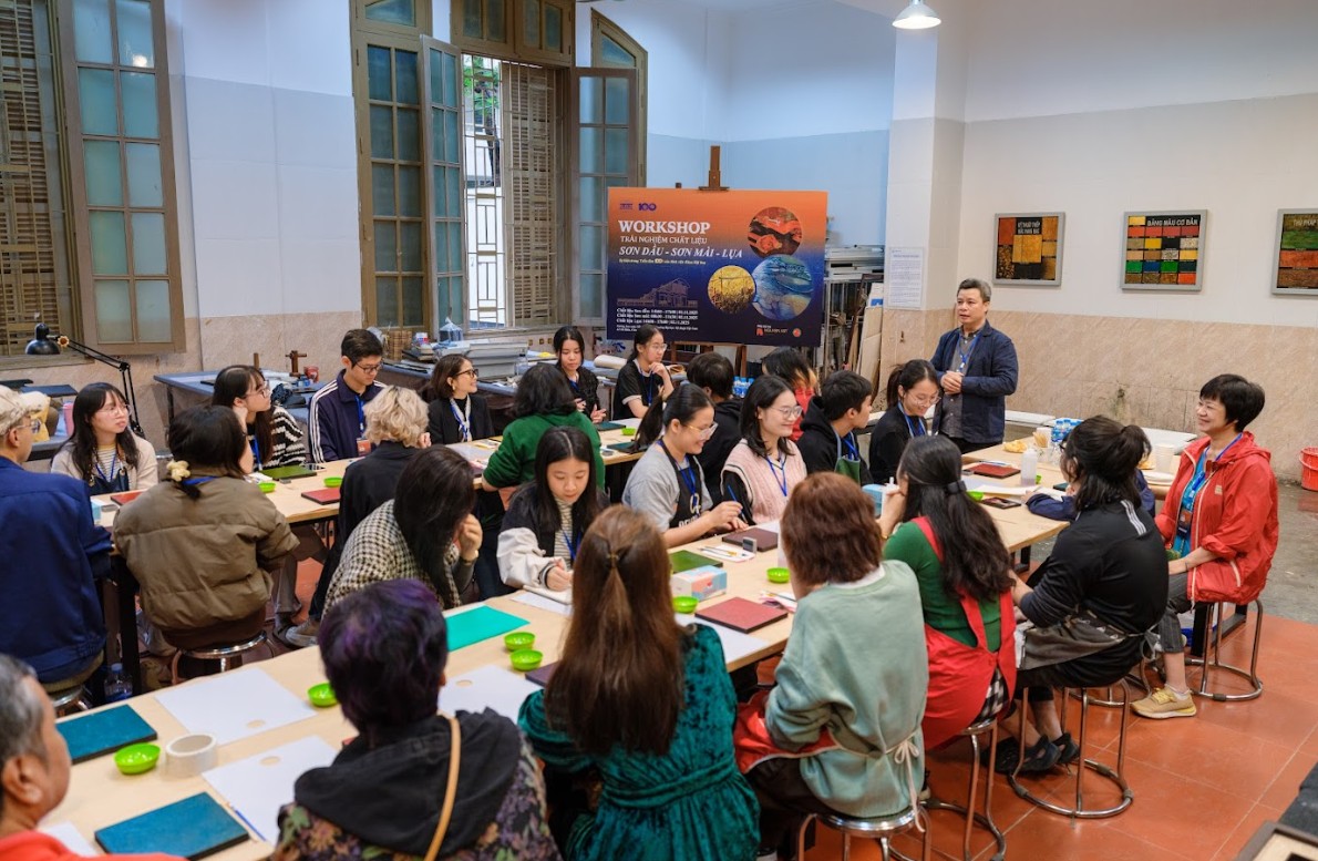 Đặc biệt, đội ngũ Nguyen Art Gallery cũng trực tiếp tham gia Workshop Sơn mài – hoạt động trải nghiệm chuyên sâu do Tiến sĩ Triệu Khắc Tiến hướng dẫn, nằm trong khuôn khổ chuỗi sự kiện kỷ niệm. Đây là dịp để các thành viên NAG được cận kề với quá trình sáng tạo của chất liệu truyền thống, thấu hiểu giá trị và sức sống bền bỉ của nghệ thuật Việt.